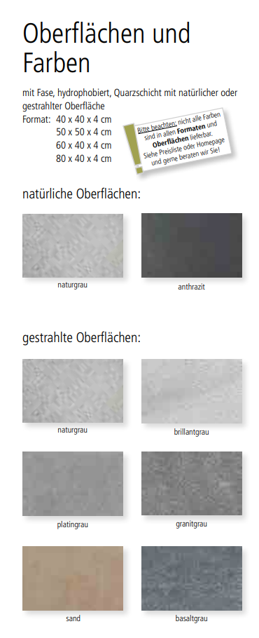 | kugelgestrahlt | basaltgrau (diese Farbe ist im Abverkauf - nur solange der Vorrat reicht), brillantgrau (diese Farbe ist im Abverkauf- nur solange Vorrat reicht), granitgrau, naturgrau, platingrau, sand (diese Farbe ist im Abverkauf-nur solange der Vorrat reicht) |